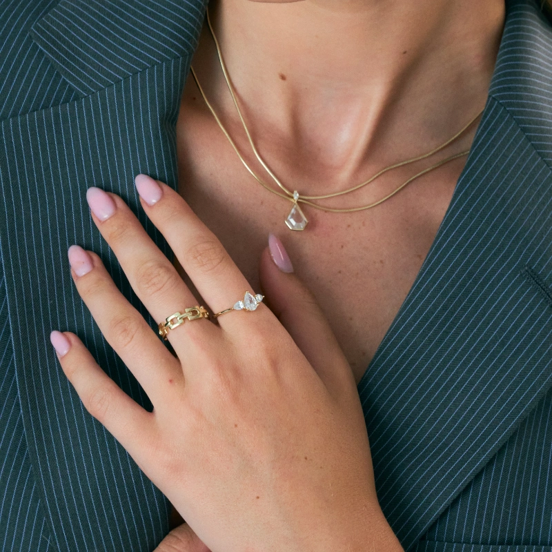 טבעת אריאל בעיצוב של שלוש אבני טיפה נוצצות המעניקות מראה קלאסי ומדויק. שילוב של עדינות ויוקרה שמוסיף ללוק שלך טאץ’ מתוחכם ומלא נוכחות.