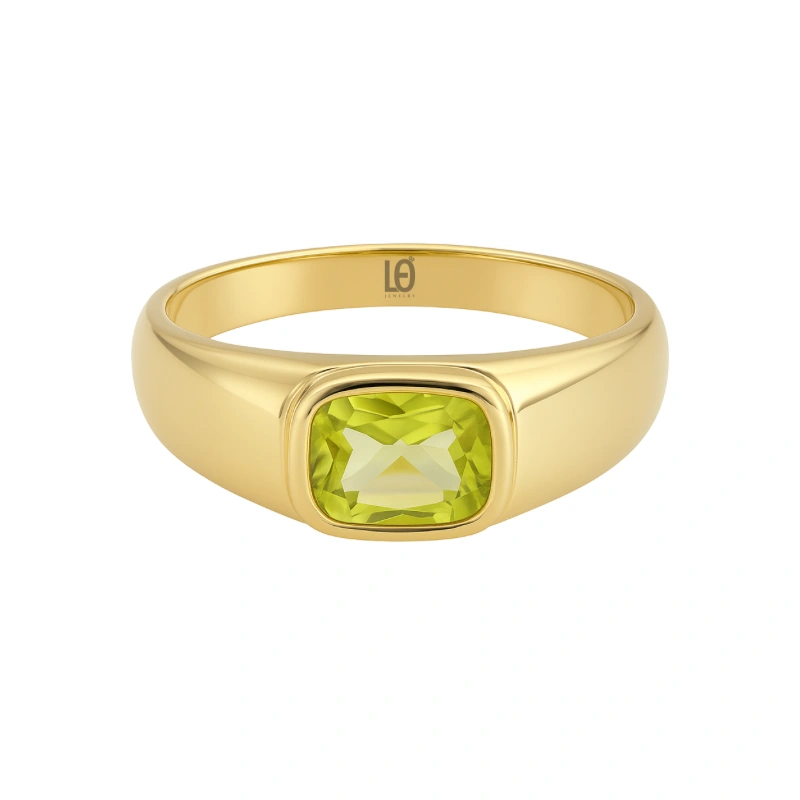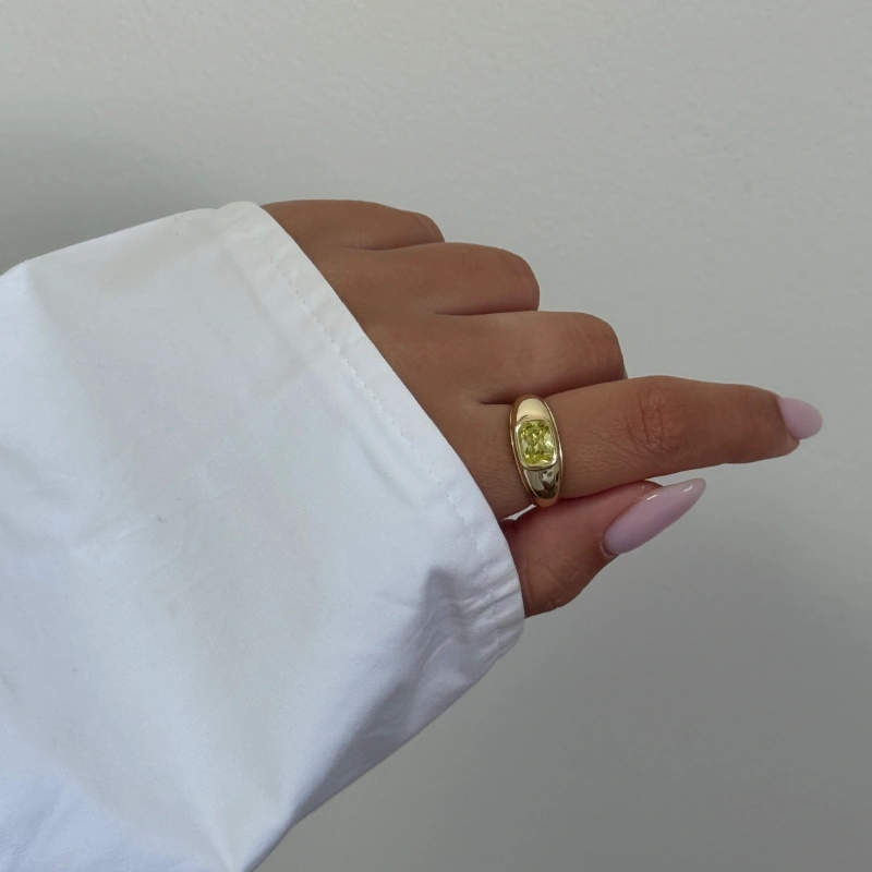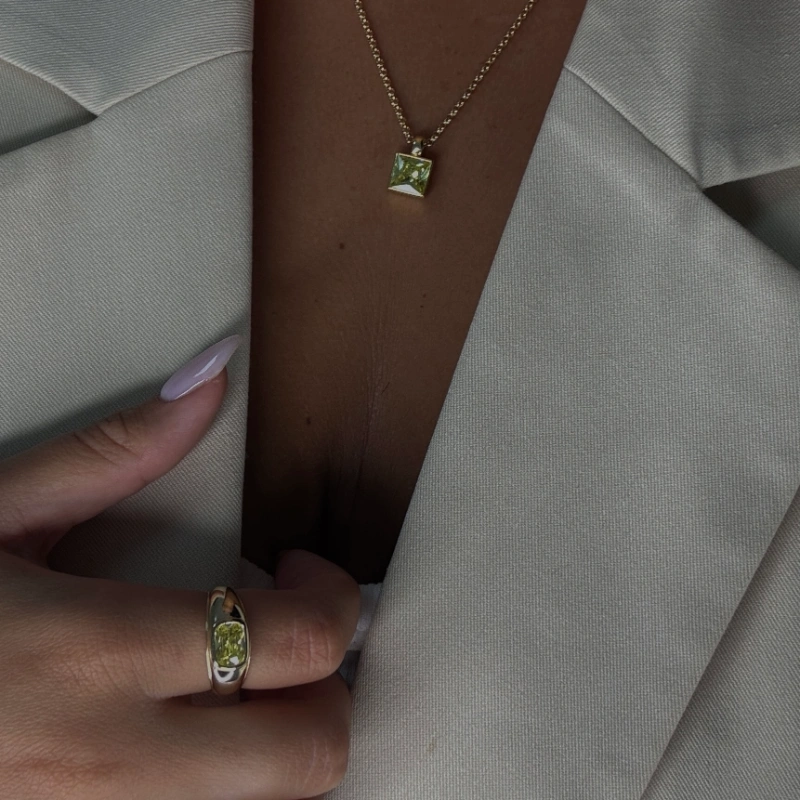 טבעת זהב עם אבן ירוקה נוצצת בגוון ירוק תפוח, הטבעת המושלמת שתוסיף לך צבע ואנרגיה לכל לוק.