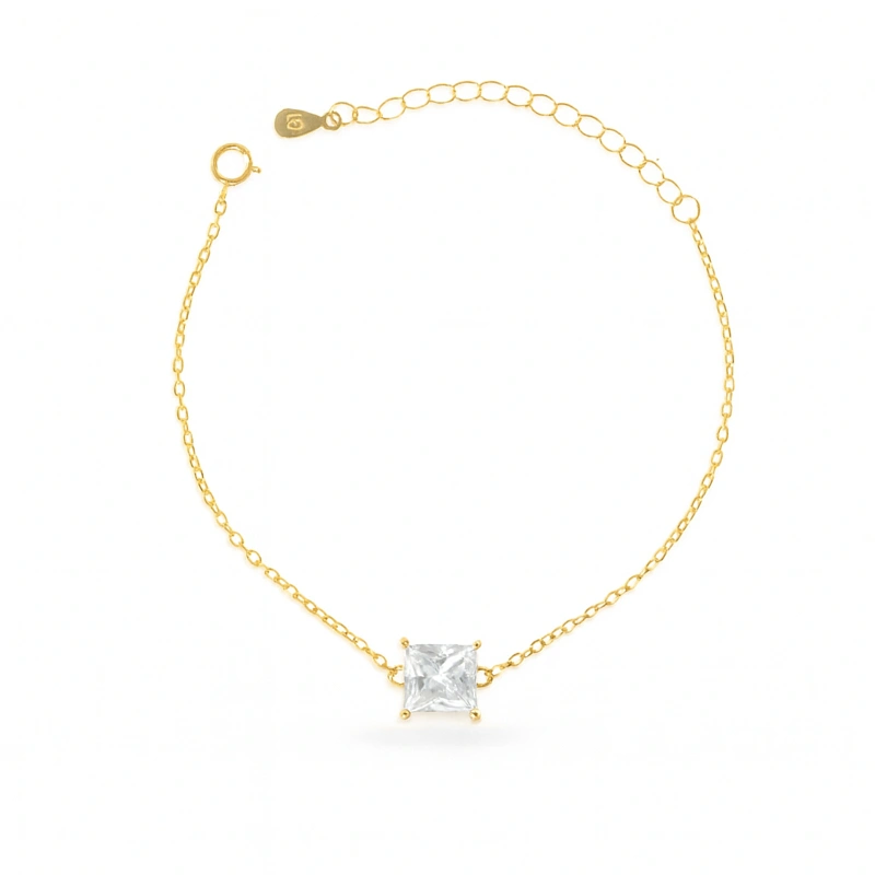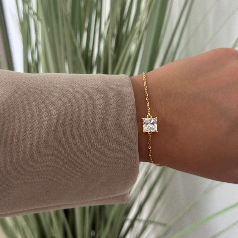 צמיד יוקרתי בצורת ריבוע עם זירקון מרכזי מנצנץ, הבחירה המושלמת למראה עדין ואלגנטי. הצמיד עשוי בעבודת יד.